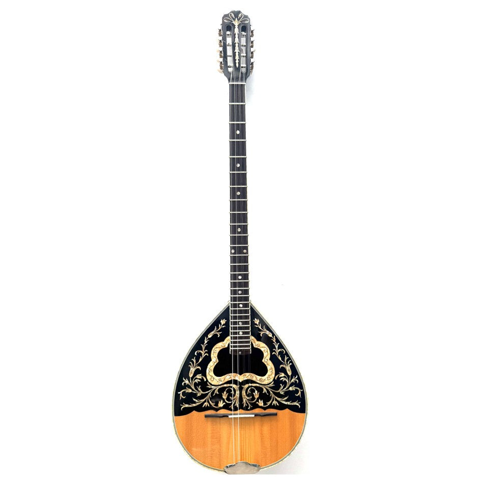 It features a tightly grained solid spruce top, walnut bowl with 16 douges (ribs), a rosewood fingerboard, properly etched decoration and pearloid binding.