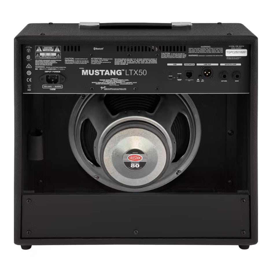 Mustang® LTX 50 is ideal for practice or performance with a 12" Celestion® G12P‐80 speaker and an optional gig‐ready 5‐button footswitch. Onboard Bluetooth® allows you to jam along with your favorite songs as well as create, edit, download and share presets using the Fender TONE® app.