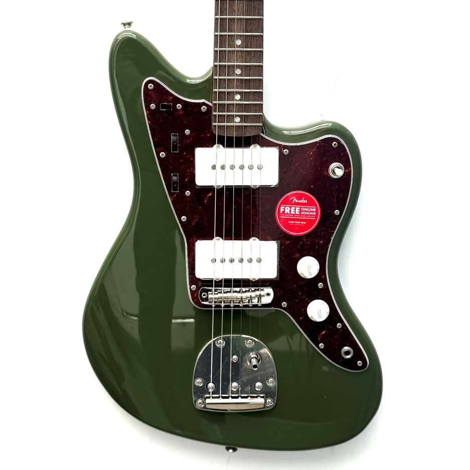 The Classic Vibe '60s Jazzmaster is a faithful and striking homage to the iconic Fender favorite, producing undeniable Jazzmaster tone courtesy of its dual Fender Designed alnico single-coil pickups. Player-friendly features include a slim, comfortable "C"-shaped neck profile with an easy-playing 9.5"-radius fingerboard and narrow-tall frets, a vintage-style tremolo system for expressive string bending effects, and a floating bridge with barrel saddles for solid string stability. This throwback Squier model also features 1960s-inspired headstock markings, rich-looking nickel-plated hardware and a slick vintage-tint gloss neck finish for an old-school vibe.