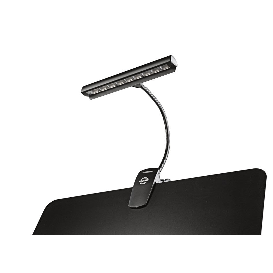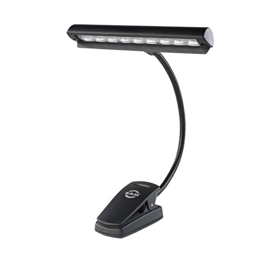 Professional orchestra light with batteries and power supply. Nine extra bright and energy-efficient LEDs provide consistent and vibrant lighting. The flexible gooseneck is fully adjustable. The light has a switch with two brightness levels. The light cone is limited to the music sheet through an anti-glare shield. An extra-strong clip provides a secure grip on music stands. The complete set is comprised of 3 AA 1.5V batteries, a power supply with a 3 m cord, as well as a durable carrying case.