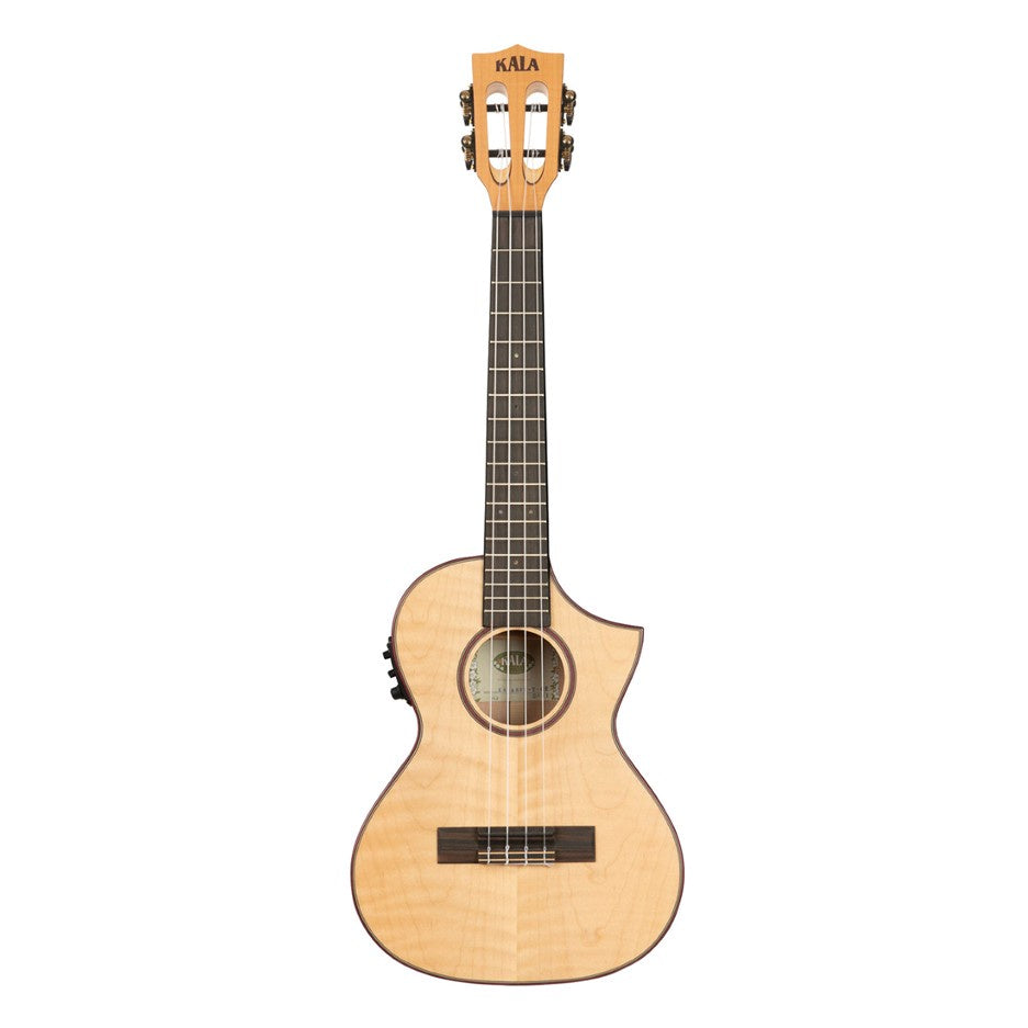 The Solid Flame Maple series is an all Maple build, including the neck. Maple offers a clear, transparent tone, and strong projection with great note separation. The figuring of the Maple is boldly accented with a purpleheart binding and rosette. Enhanced with a slotted headstock, Florentine cutaway, and an onboard Fishman Kula EQ, this tenor ukulele stands out in a crowd.